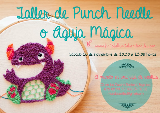 Bajo la Lluvia Handmade nos trae un  taller sobre una de las técnicas más de moda en la actualidad, punch needle también conocido como aguja magica o bordado ruso, ya que es una técnica perfecta para un taller porque es sencilla y rápida de aprender. Es un tipo de bordado en el que no se tienen que tener conocimientos previos. Se puede empezar desde cero obteniendo, al acabar el taller, el primer resultado. Además es un bordado en el que se puede jugar con distintas texturas por lo que da mucho juego.