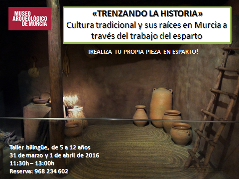Los días 31 de marzo y 1 de abril se realizará en el Museo Arqueológico de Murcia el taller infantil "Trenzando la Historia" en el que los niños/as de entre 5 y 12 años podrán profundizar en la cultura tradicional de nuestra huerta murciana, relacionando el trabajo del esparto con sus raíces en la Prehistoria e Historia Antigua.
