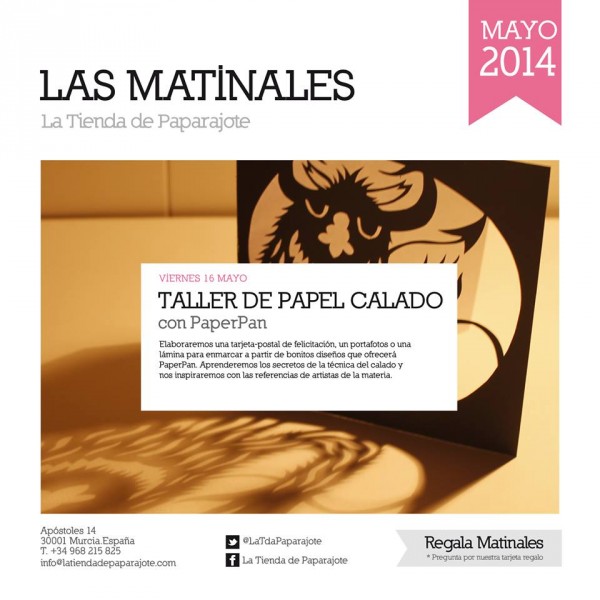 En el taller realizaremos una tarjeta-postal para felicitar, un portafotos o una lámina para enmarcar, utilizando como base diseños que aporta PaperPan o los elaborados por los propios alumnos. Aprenderemos sobre la técnica del Papel calado, su historia y haremos un recorrido visual por el trabajo de los artistas contemporáneos más destacados que la usan en sus creaciones.