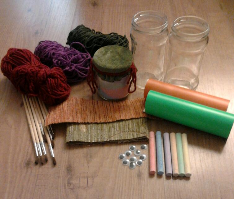 Cada niño/a realizará una manualidad que consiste en rellenar un bote de vidrio con sales de colores mediante tizas. Primero coloreará las sales con tizas, y después decorará el bote con vinilo, telas, lana, cuerda y témperas.