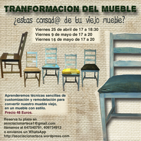 - Viernes 9 de mayo de 17 a 20 horas. En la segunda sesión todos los participantes vendrán con sus muebles para comenzar con los “cambios de looks” del mueble, todos asistirán con los materiales que necesiten y que no se ofrecen en el taller.