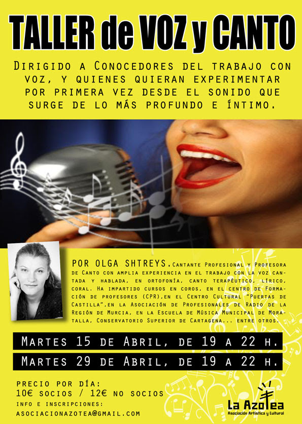 Por: OLGA SHTREYS. Cantante Profesional y Profesora de Canto con amplia experiencia en el trabajo con la voz cantada y hablada, en ortofonía, canto terapéutico, lírico, coral. Ha impartido cursos en coros, en el centro de Formación de profesores (CPR),en el Centro Cultural “Puertas de Castilla”,en la Asociación de Profesionales de Radio de la Región de Murcia, en la Escuela de Música Municipal de Moratalla, Conservatorio Superior de Cartagena etc…