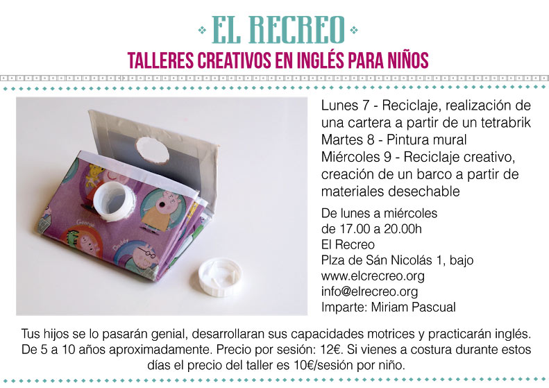 A partir del próximo lunes 7 de julio empiezan en "El Recreo" con talleres creativos para niños en inglés. Puedes llevar a tus hijos los lunes, martes o miércoles de 18:00h a 20:00h durante todo el verano.