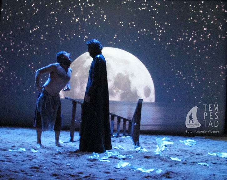 Teatro “dentro del teatro dentro de la vida”. Northrop Frye identificó una vez a Próspero con Shakespeare, en un sentido altamente irónico, encontrando también en Próspero a “un actor-administrador acosado y exhausto de trabajar, que regaña a los actores perezosos, alaba a los buenos con un lenguaje de conocedor, imagina tareas para los ociosos, constantemente al tanto de su tiempo limitado antes de que empiece la función, para al final, salir a implorar el aplauso del público”. En base a esta premisa se plantea esta Tempestad: los actores son personajes que actúan en una ficción que tan pronto parece realidad como se convierte de nuevo en un cuento que habla de la VIDA con mayúsculas. Cinco intérpretes masculinos, un técnico de sonido y un técnico de iluminación, darán vida a los 20 personajes de la obra, como si de un malabarismo circense se tratara. La comedia llega a su supuesto final feliz, la ficción ha enderezado los entuertos y promete un futuro dichoso con el amor de los dos jóvenes. Pero sabemos que todo es teatro; un sueño bello y prodigioso puesto en escena. Y al acabar la función, tenemos que volver a la realidad, una realidad que hasta ahora se nos ha escamoteado doblemente, porque hemos estado viendo teatro dentro del teatro. Y todo vuelve a ser lo que era. Los hombres no cambian. Los monstruos no cambian. Todo ha sido pura ficción, truco, teatro. El mago abandona sus poderes para aceptar con melancolía la realidad, y a través de él, Shakespeare, dice también adiós a su fantasía, igual que Cervantes hace que Alonso Quijano se despoje del don de la locura. Es el tránsito de la ilusión al desengaño. Del arte a la vida.