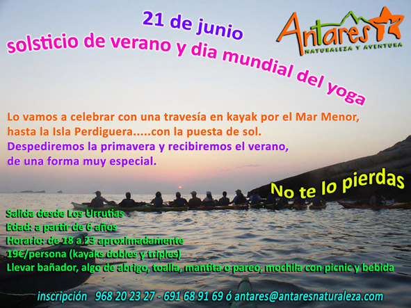 Por todo ello Antares Naturaleza y Aventura han querido celebrarlo de una forma muy especial, con una travesía en KAYAK por el Mar Menor al atardecer, hasta la isla Perdiguera, desde donde haremos nuestro saludo al sol cuando se oculte en el horizonte, llenando nuestros sentidos con el sonido de las olas, la brisa marina, el olor a mar y el contacto cálido de la arena.