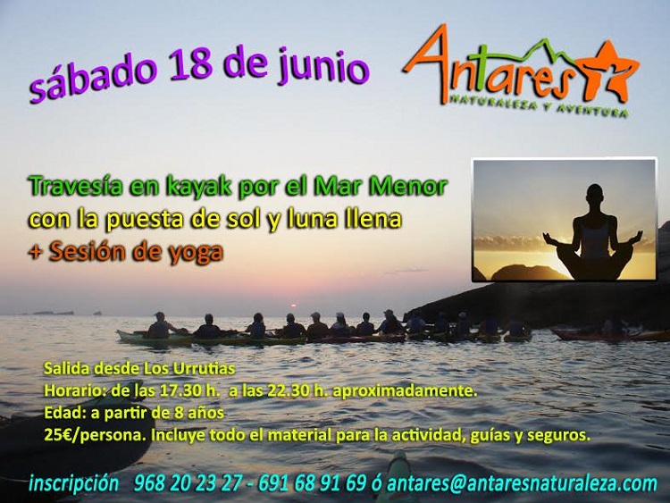 Antares Naturaleza y Aventura ha organizado para el próximo sábado 18 de junio una travesía en kayak por el Mar Menor con la puesta de sol y la luna llena. Esta actividad irá acompañada de una sesión de yoga.