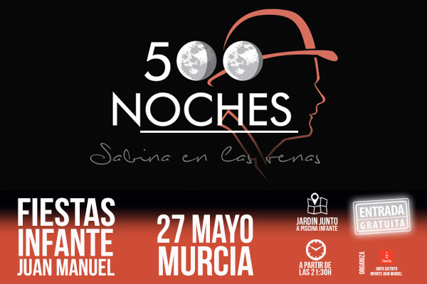 El sábado 27 de mayo a las 21:30 horas en la en la Piscina Infante Juan Manuel de Murcia se subirá al escenario 500 Noches, banda tributo a Joaquín Sabina que convierte sus conciertos en una auténtica experiencia y homenaje al cantautor. Con un impresionante parecido en la voz, 500 noches presenta un viaje a través de la música y la poesía de Sabina.