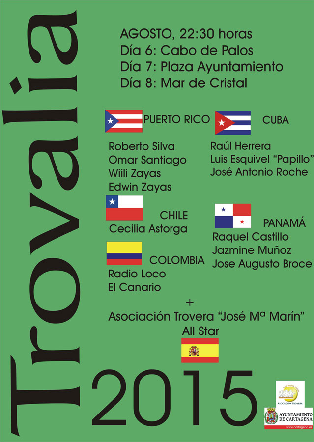 Trovalia vuelve con el verano a Cartagena, siendo uno de los festivales más importantes en el mundo del trovo. Esta edición congrega a troveros, payadores, repentistas y trovadores de primer orden. La Asociación Trovera José María Marín, junto con la colaboración del Ayuntamiento de Cartagena, organiza el Festival, que se desarrollará durante los días 6, 7 y 8 de agosto.