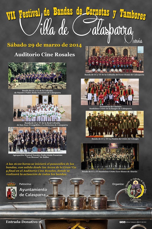 El sábado, 29 de marzo, se celebra una nueva edición del Certamen de Bandas de Cornetas y Tambores Villa de Calasparra. En esta séptima edición, además de las Bandas locales, como invitadas actuarán la Banda de CC y TT La Pasión de Cristo, de Cehegín; la Agrupación Musical Nuestro Padre Jesús Nazareno "Los Moraos", de Bullas y la Banda de CC y TT Santísimo Cristo del Ecce-Homo, de Abarán.