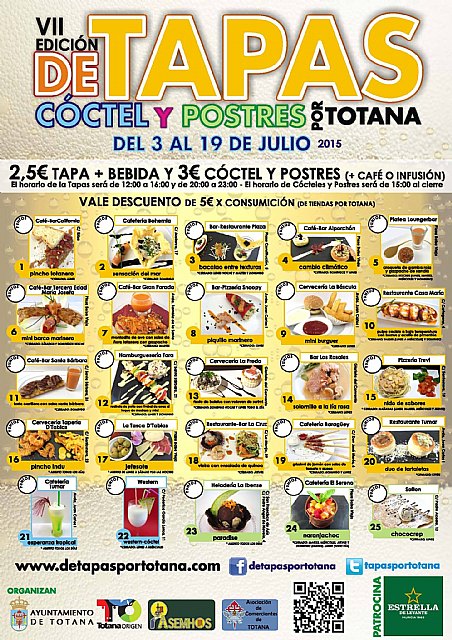 La “VII Ruta de Tapas, Cóctel y Postres de Totana” se celebrará del 3 al 19 de julio, ambos inclusive, y contará con la participación de 25 establecimientos hosteleros de esta localidad y otros 13 comercios en los que se canjearán las promociones incluidas en este concurso.