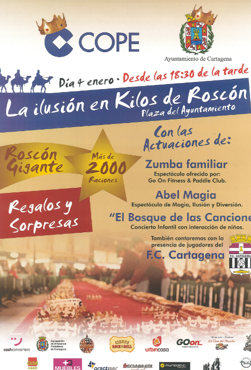 Más de dos mil raciones de roscón se repartirán este próximo domingo 4 de enero entre todos los asistentes. Una iniciativa que cumple ya tres años y que con cada edición se hace más grande. Concretamente este año serán 150 metros de pastel realizado por la Agrupación de Artesanos Pasteleros de Cartagena. Además, en el interior del roscón, niños y mayores podrán encontrar multitud de sorpresas y regalos. A lo largo de la tarde, habrá distintas actuaciones para niños y familiares.