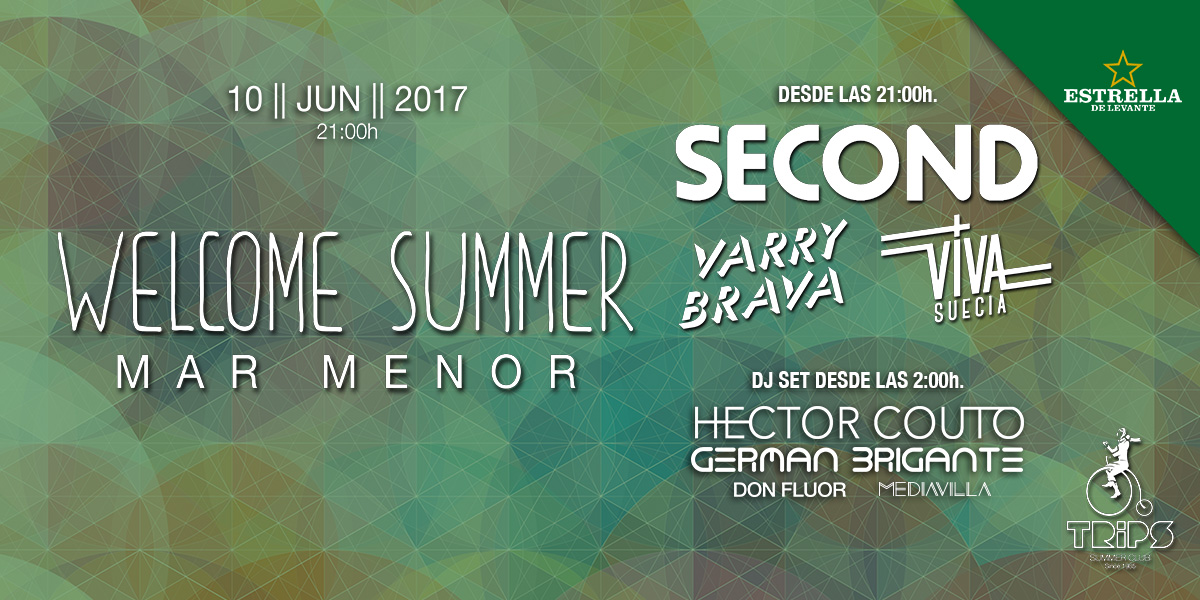 Los murcianos Second, Viva Suecia, Varry Brava y los Djs Hector Couto, German Brigante, Don Fluor y Mediavilla serán los protagonistas el 10 de Junio de la primera gran fiesta de este verano 2017 en Discoteca Trips, con el patrocinio de Estrella de Levante.