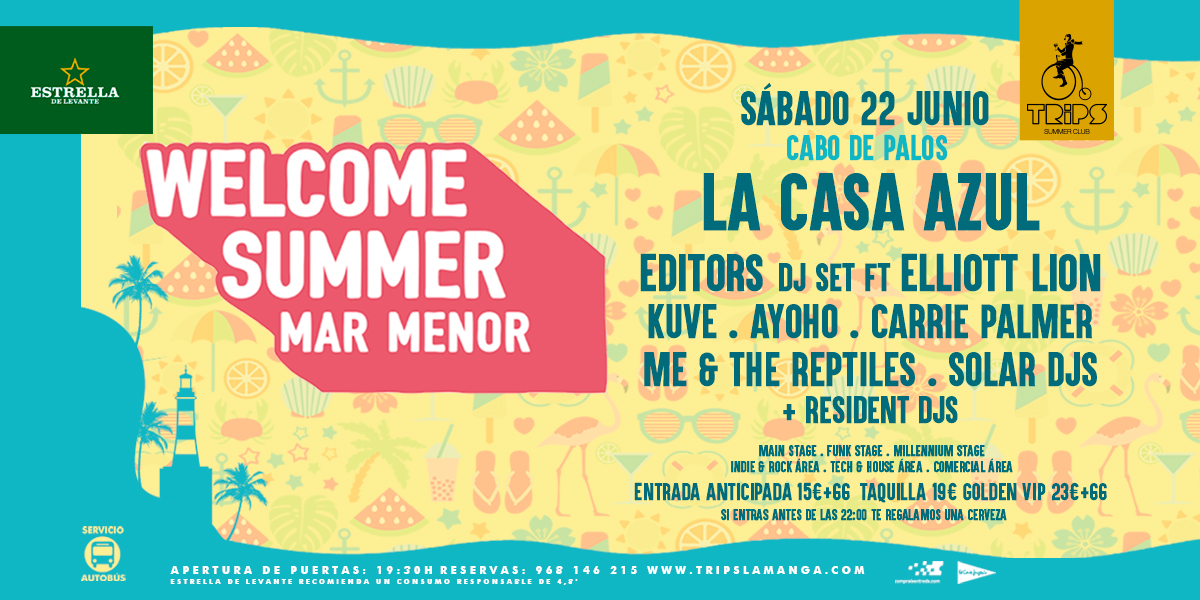 Welcome Summer Mar Menor 2019_ Welcome Summer Mar Menor celebra su 3ª edición el 22 de Junio en Trips Summer Club. HORARIO A partir de las 19:30 horas. ENTRADAS Entrada anticipada: 15€ (+ gastos)Entrada en taquilla: 19€