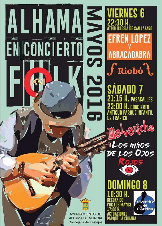 Tras varios años, se ha recuperado el apreciado festival Alhama en Concierto Folk, que se realizará del 6 al 8 de mayo, organizado por Surefolk, Malvariche y el Ayuntamiento de Alhama de Murcia.